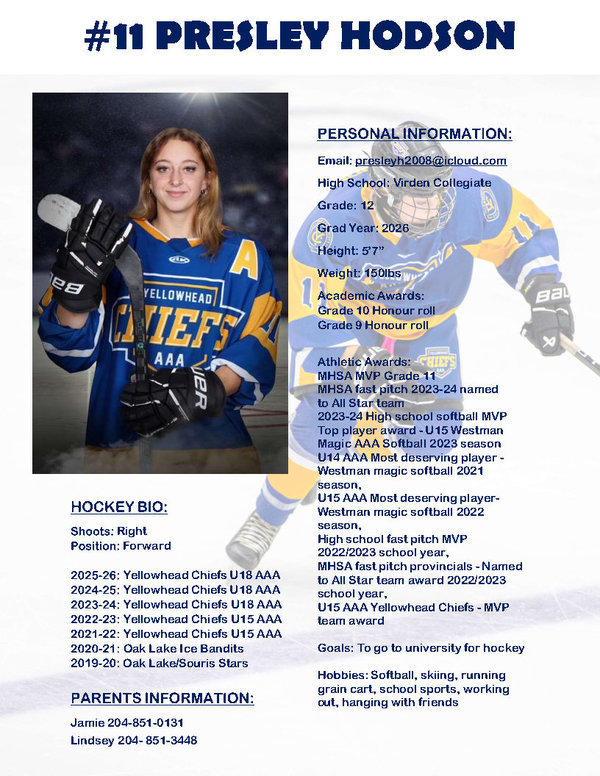 | 10/11/25 | Yellowhead Chiefs Female U18 AAA | Weyburn | L6-3 | 1 | 60 | | | | 4 | .00 | .00 |