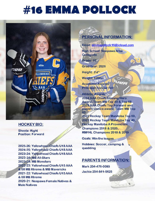 | 10/10/25 | Yellowhead Chiefs Female U18 AAA | @NAX | W4-2 | 1 | 60 | 1 | | 1 | | 1.00 | 1.00 |