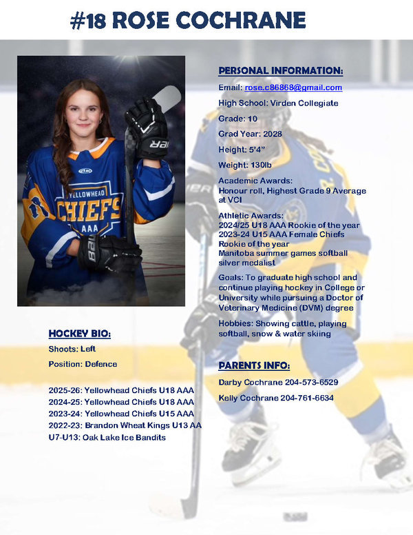 | 9/19/25 | Yellowhead Chiefs Female U18 AAA | Westman Wildcats | L6-2 | 1 | 60 | | | | | .00 | .00 |