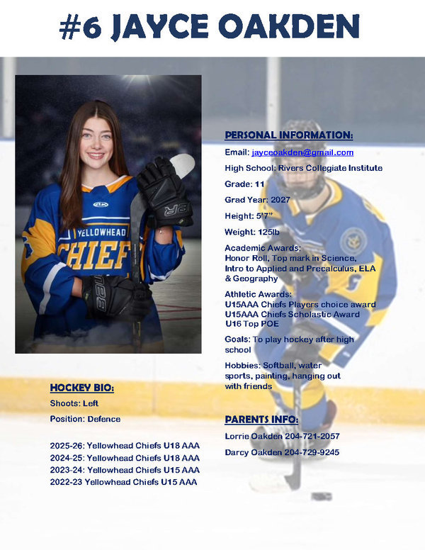 | 10/11/25 | Yellowhead Chiefs Female U18 AAA | Weyburn | L6-3 | 1 | 60 | 1 | 1 | | 1.00 | 1.00 |