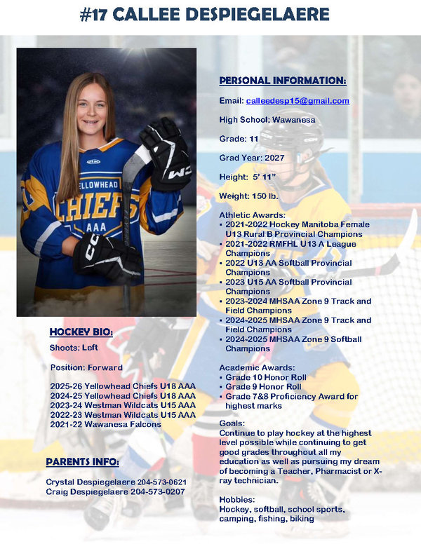 | 11/15/25 | Yellowhead Chiefs Female U18 AAA | @Central Plain Capitals | W5-2 | 1 | 60 | 1 | 1 | | 1.00 | 1.00 |